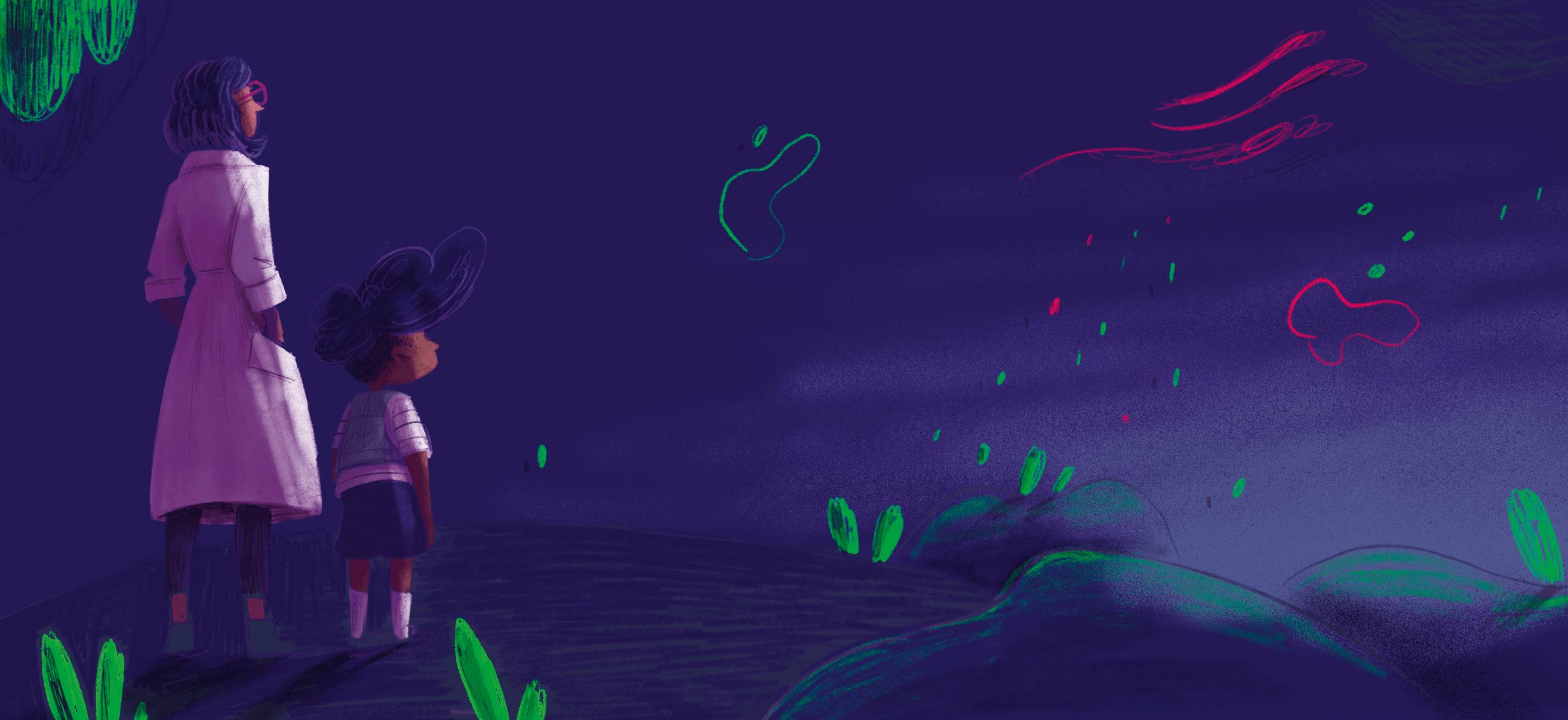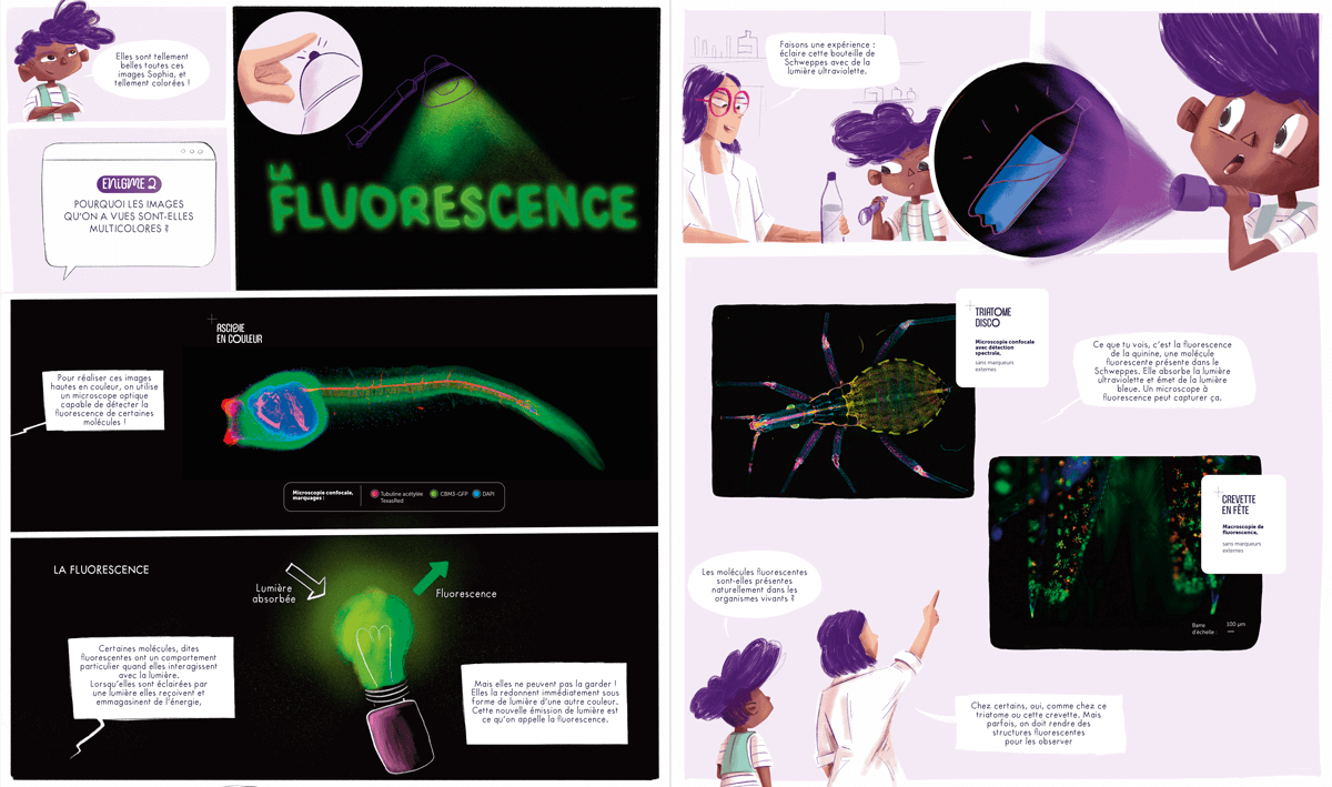 Avec deux personnages hauts en couleurs, nous embarquons petits et grands dans une aventure scientifique inspirée des images fascinantes obtenues au microscope par fluorescence.
